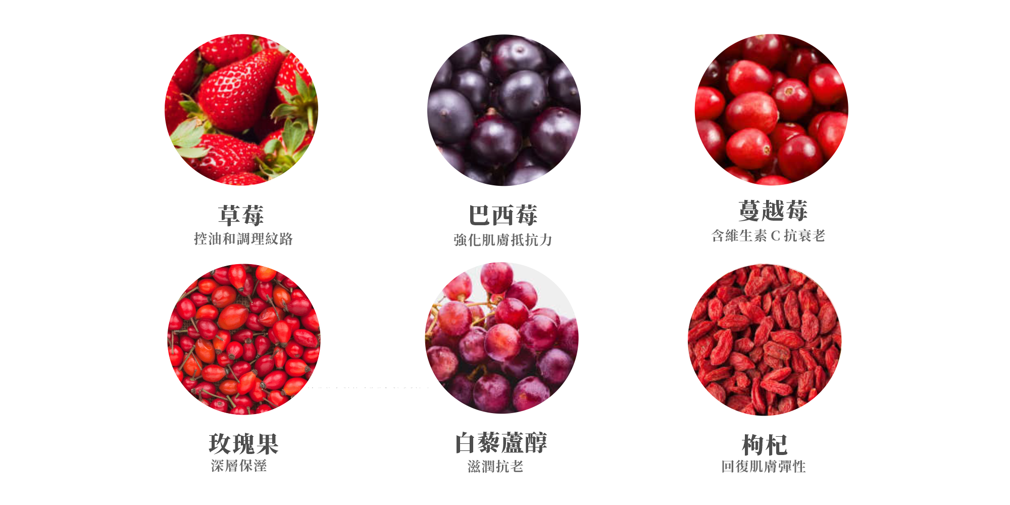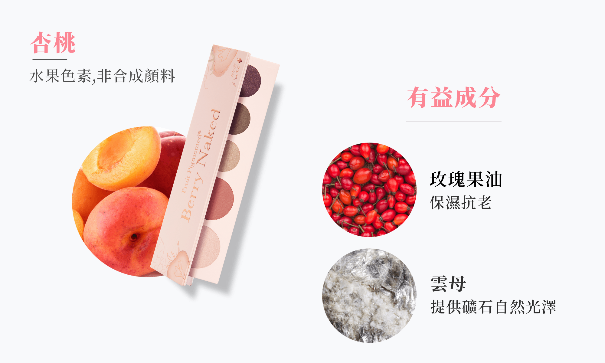 +眼影:稻米澱粉,可可,杏子,李子,香草,石榴, 越橘(藍莓),覆盆子,阿拉伯咖啡種子,番木瓜水果,茄子(番茄)水果/葉/莖,山茶(紅茶)葉,巴西紫莓,玫瑰果油,石榴籽油,酪梨油,可可種籽油,白藜蘆醇,抗壞血酸鈉(維生素C),生育酚(維生素E),雲母