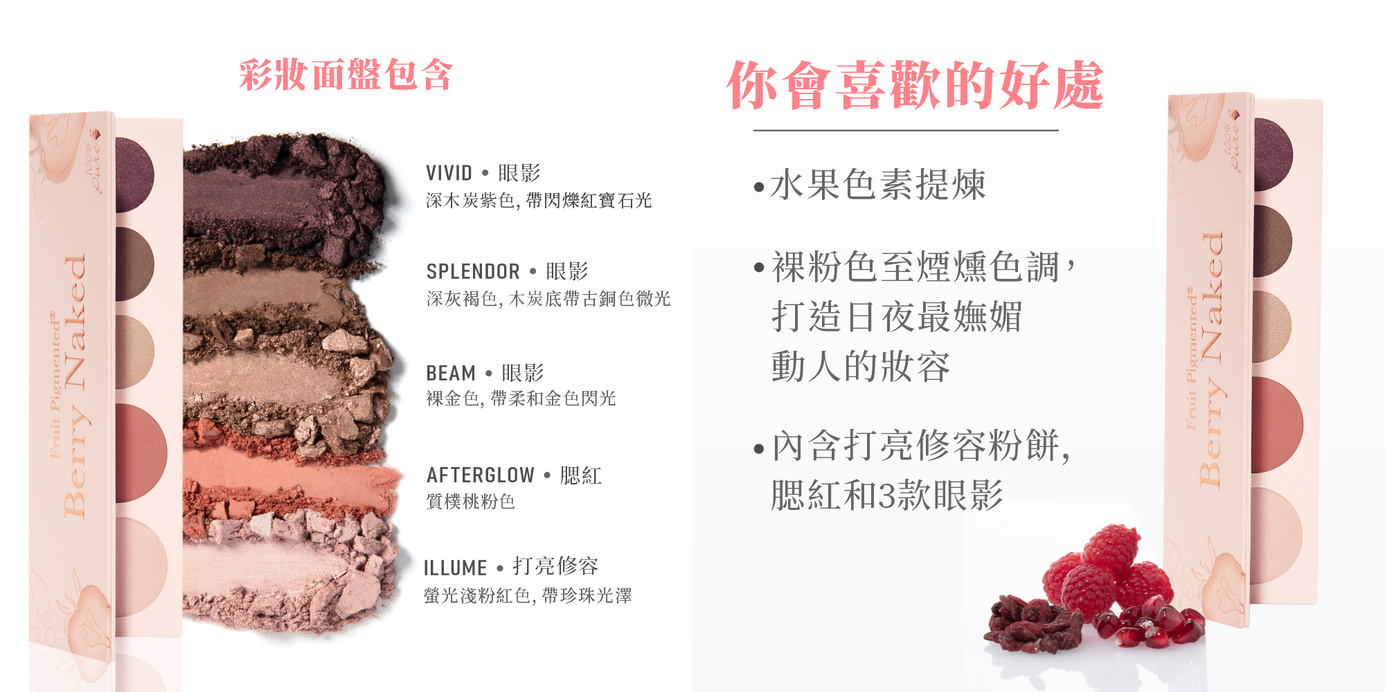 含豐富維生素的水果和植物成分,包含打亮修容粉餅+腮紅+三色眼影,為完整的臉部彩妝面盤。