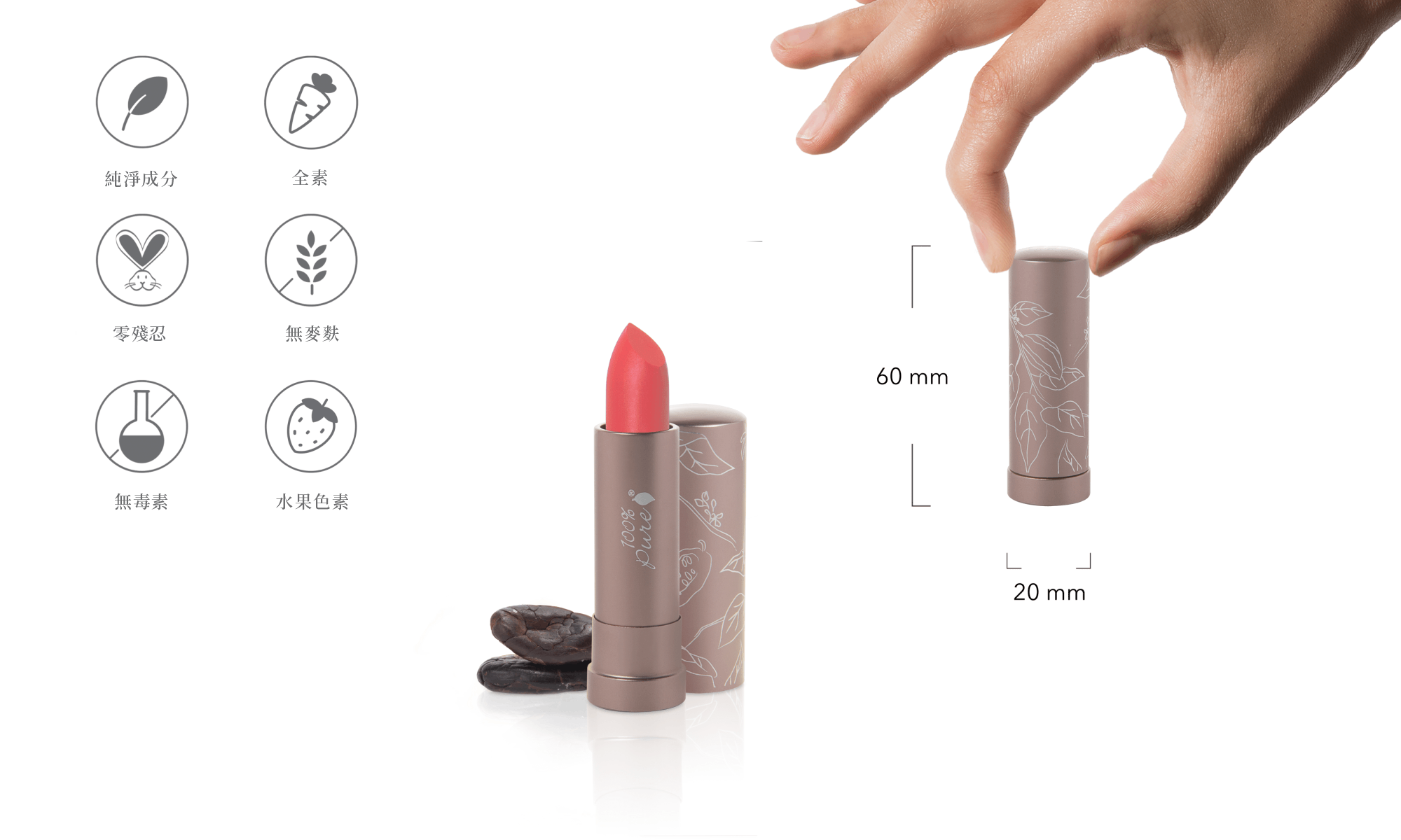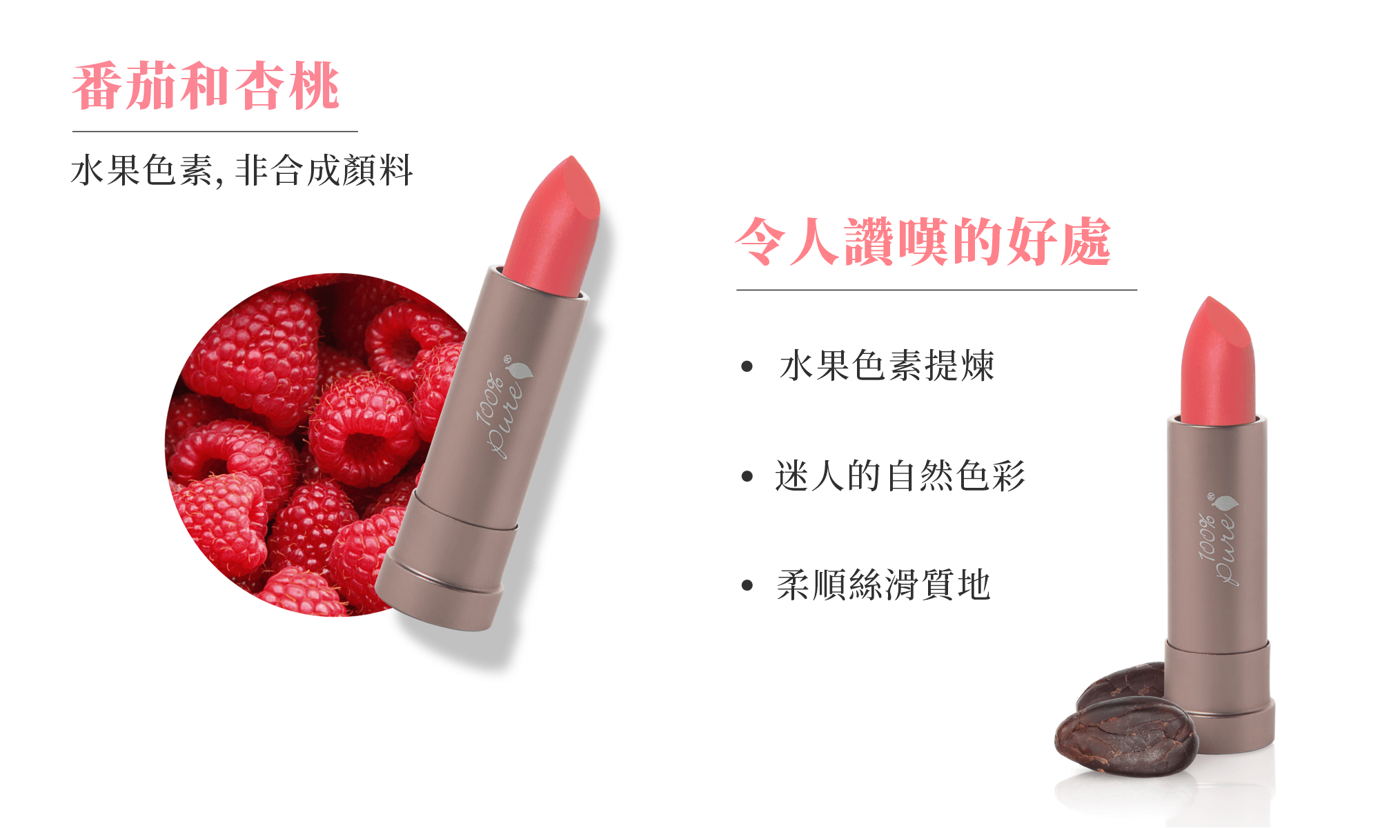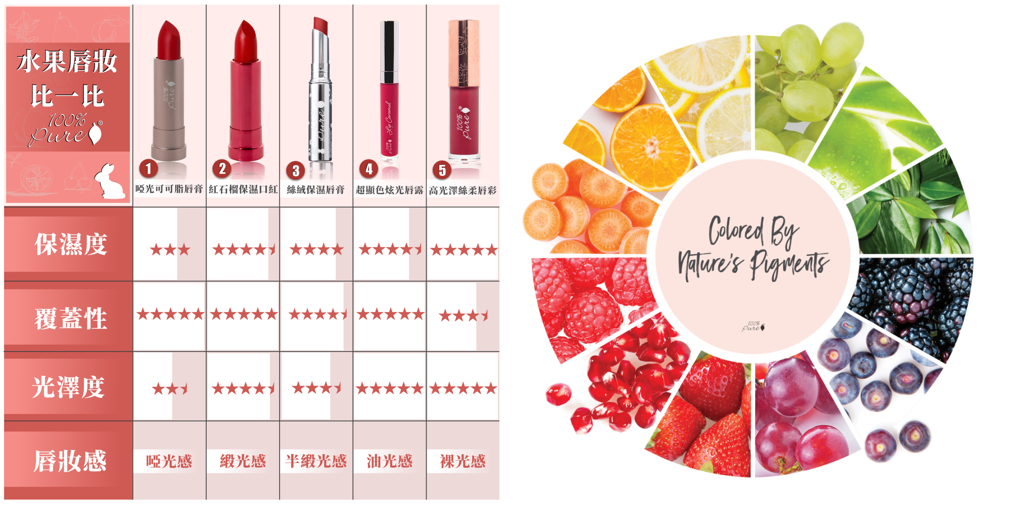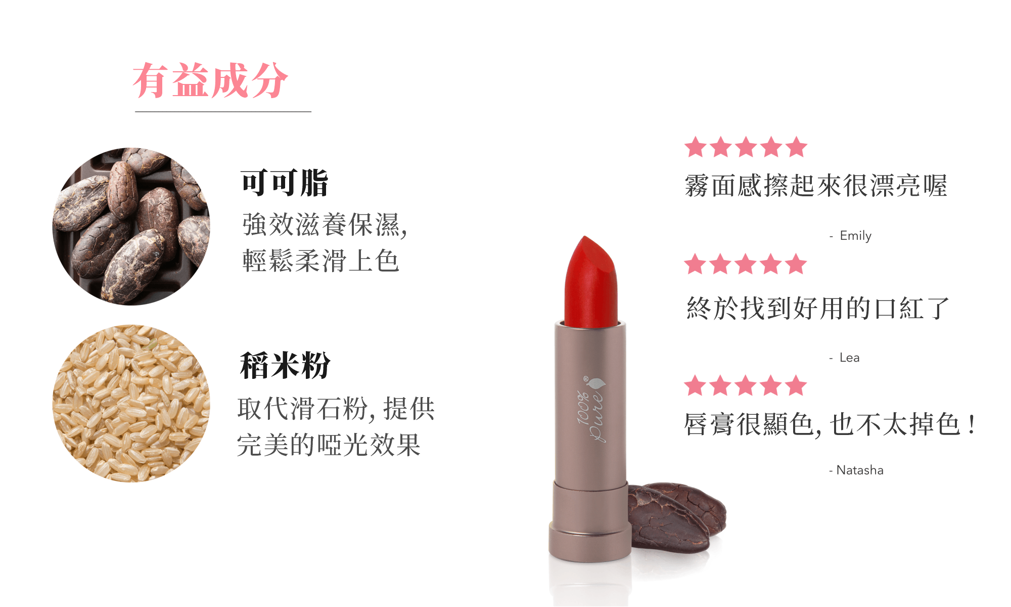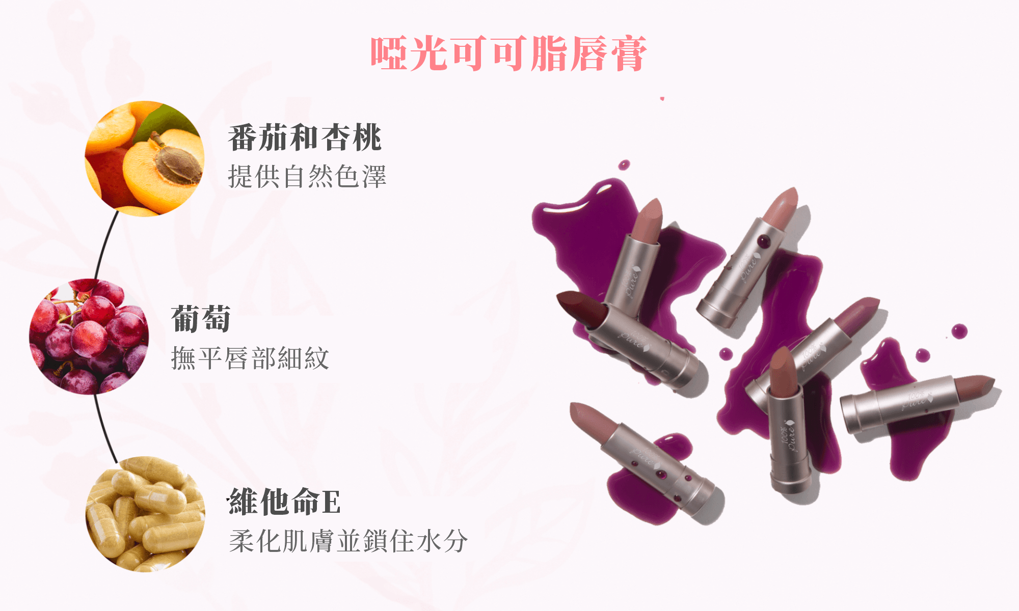 採用水果色素提煉,添加創新的啞光配方,富含巧克力和多重營養的水果如櫻桃、藍莓和桃子等,結合可可脂、乳木果油和維生素 E,保護雙唇不失色,呈現柔美的啞光感。