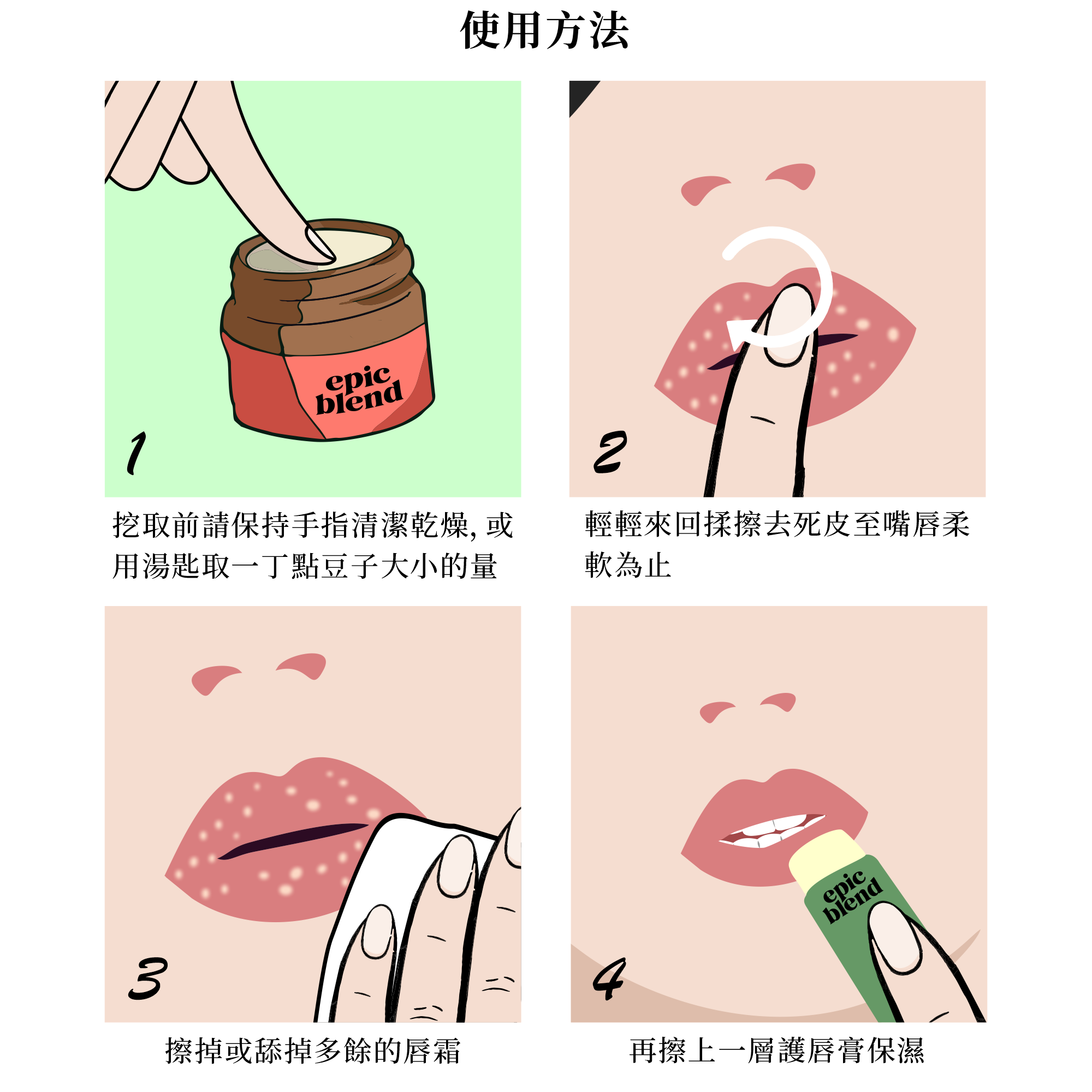 使用方法 : 取一丁點豆子大小的用量,輕輕來回揉擦去死皮至嘴唇柔軟為止,再擦掉多餘的唇霜。