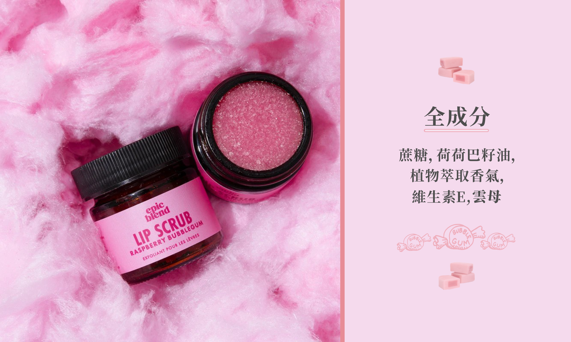 + 覆盆子泡泡糖 : 蔗糖,荷荷巴籽油,覆盆子香氣,維生素E (生育酚),雲母,二氧化鈦,氧化鐵