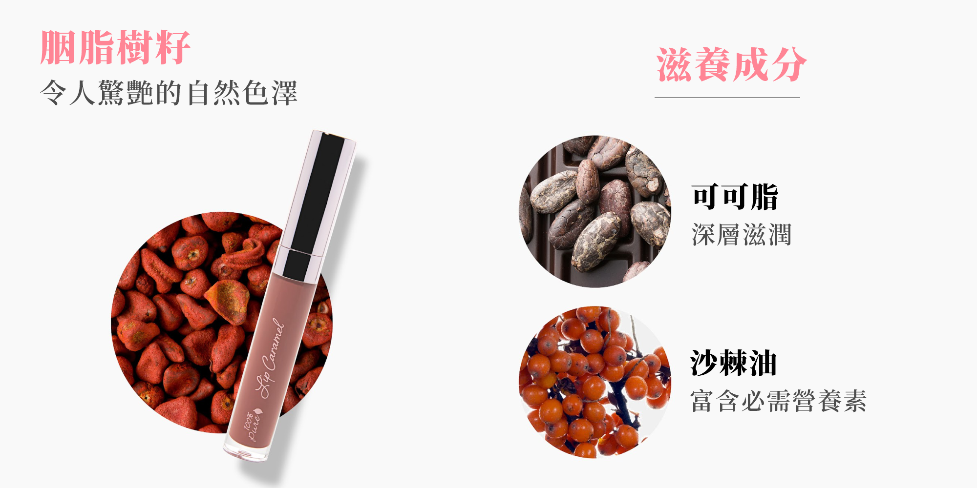 胭脂樹籽、石榴籽油、可可脂、紅櫻桃、懸鉤子果(覆盆子)、葡萄果、石榴、越橘(藍莓)、黑莓、可可皮、桃果、黑醋栗、越橘、杏、薑黃、沙棘油、乳木果油、生育酚(維生素 E)、植物甘油、小燭樹蠟、迷迭香、牛至、百里香花/葉、稻米澱粉