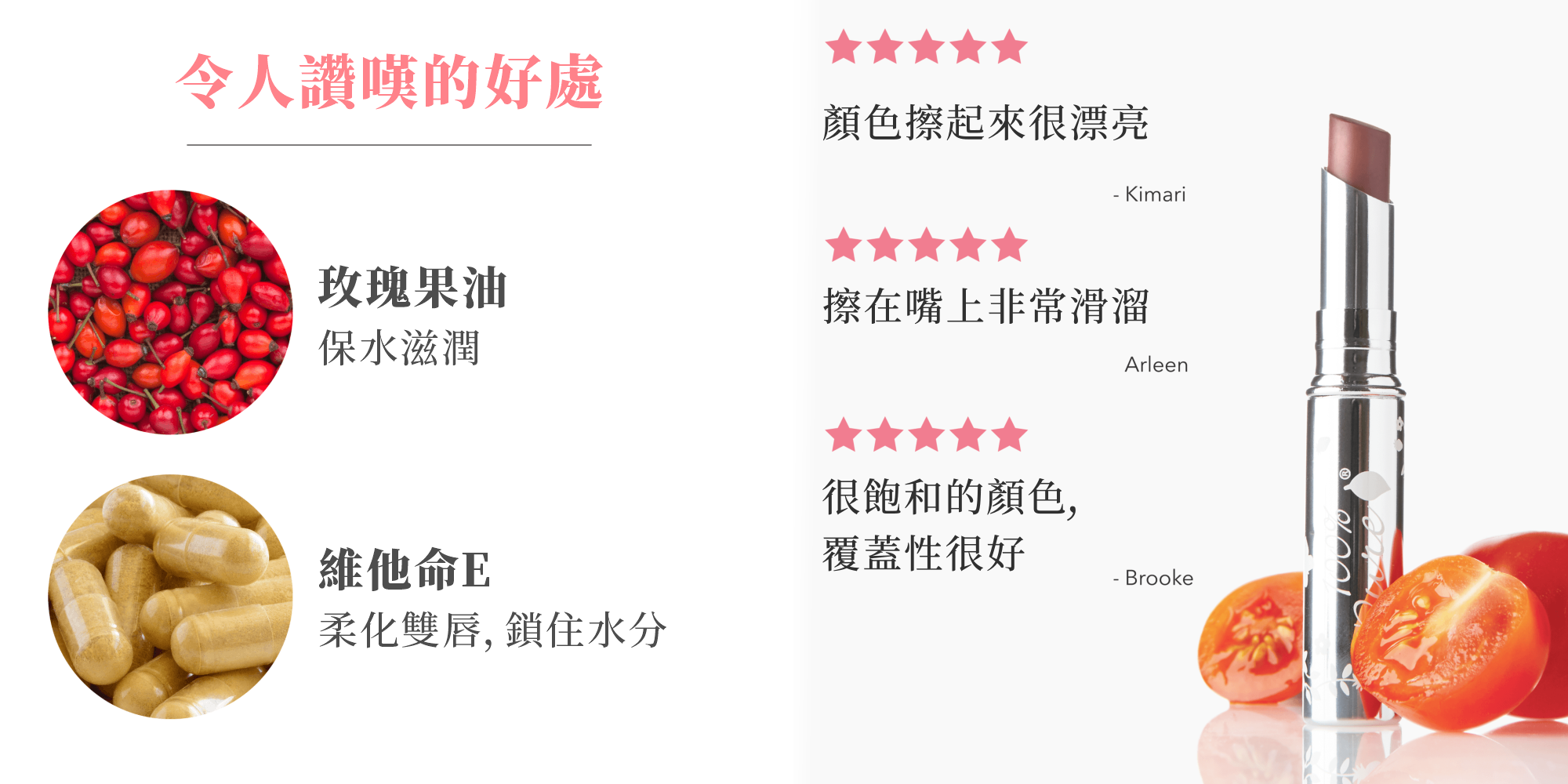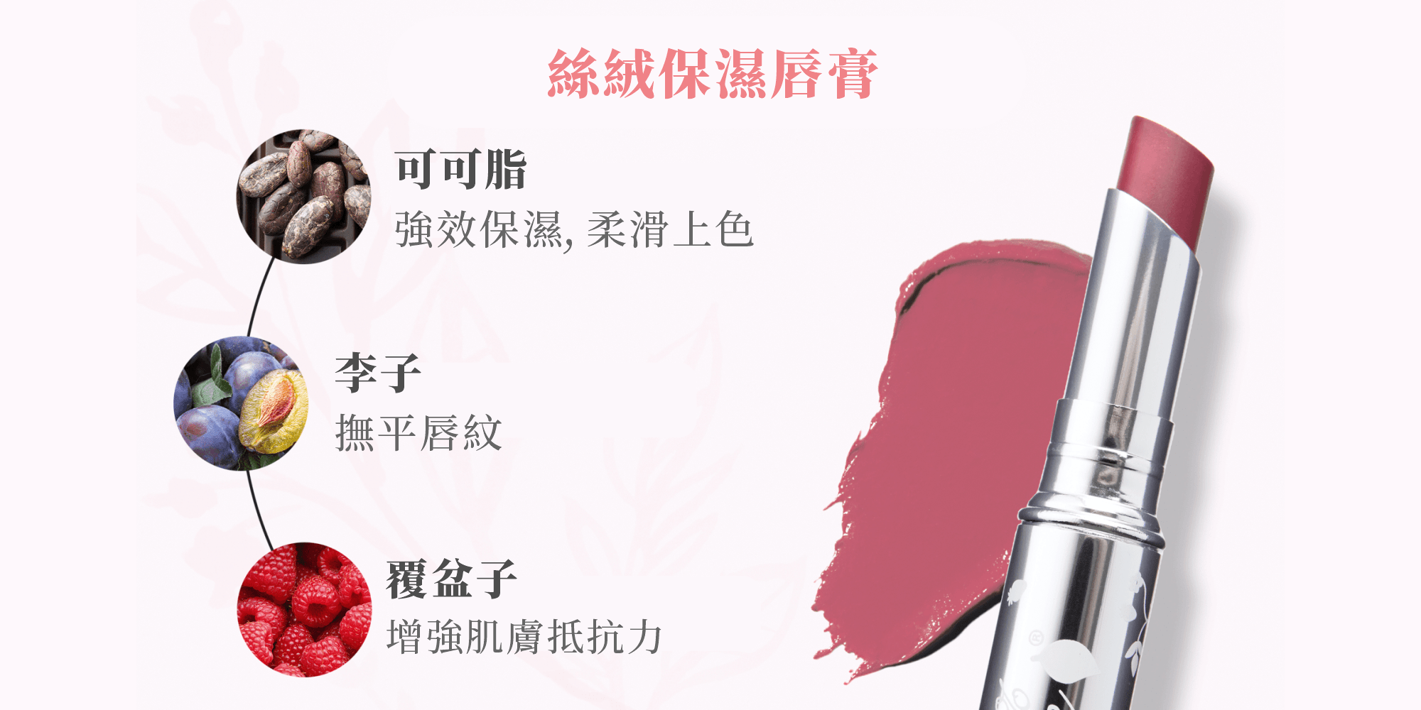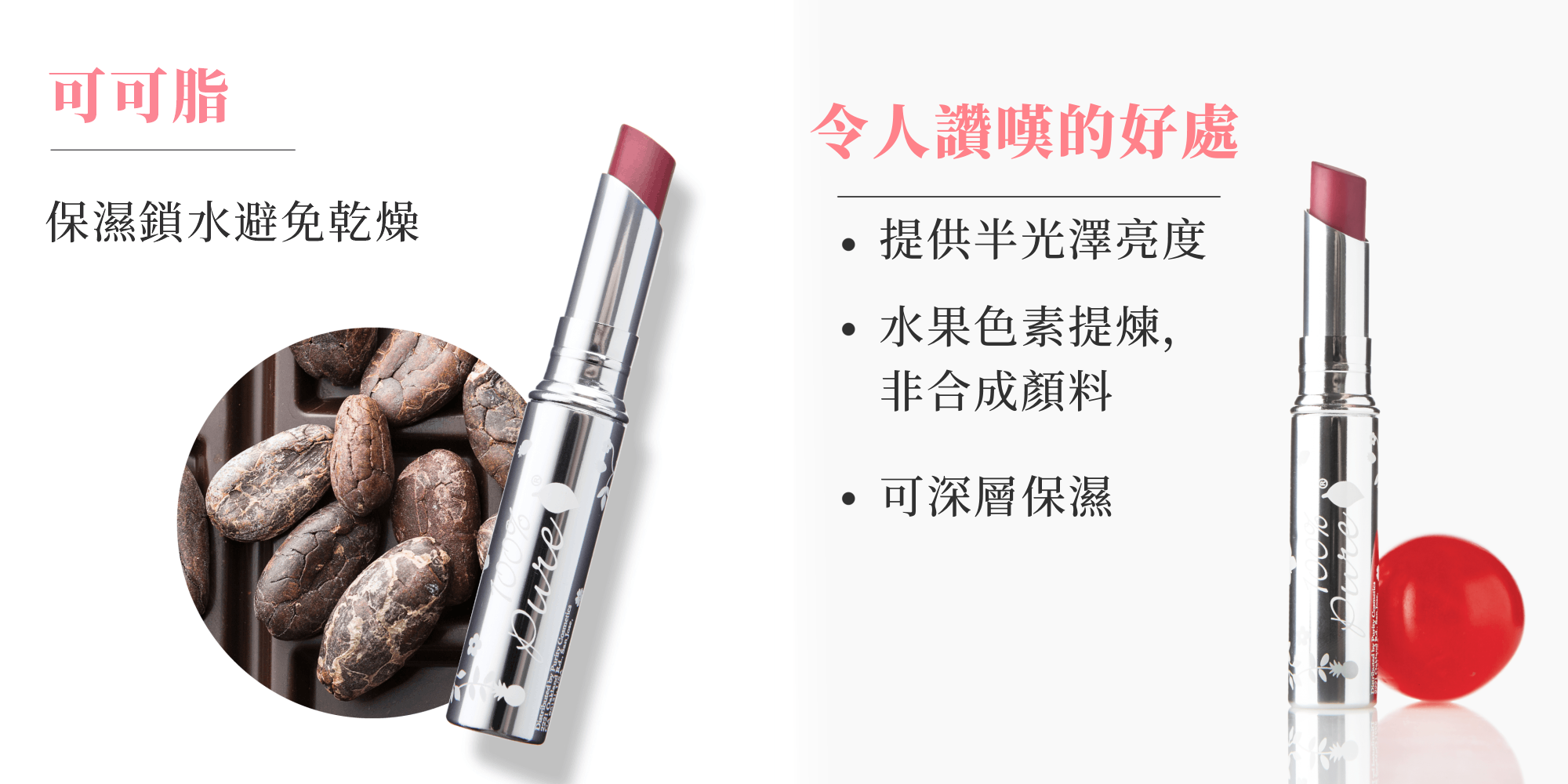 由水果色素提煉,內含酪梨油,可可脂,玫瑰花瓣和薰衣草油,可溫和舒緩乾燥細膩的嘴唇,提供中等到全覆蓋的半光澤度,帶來自然唇色的輕盈滋潤,同時富含豐富維生素,使雙唇更加柔軟飽和。